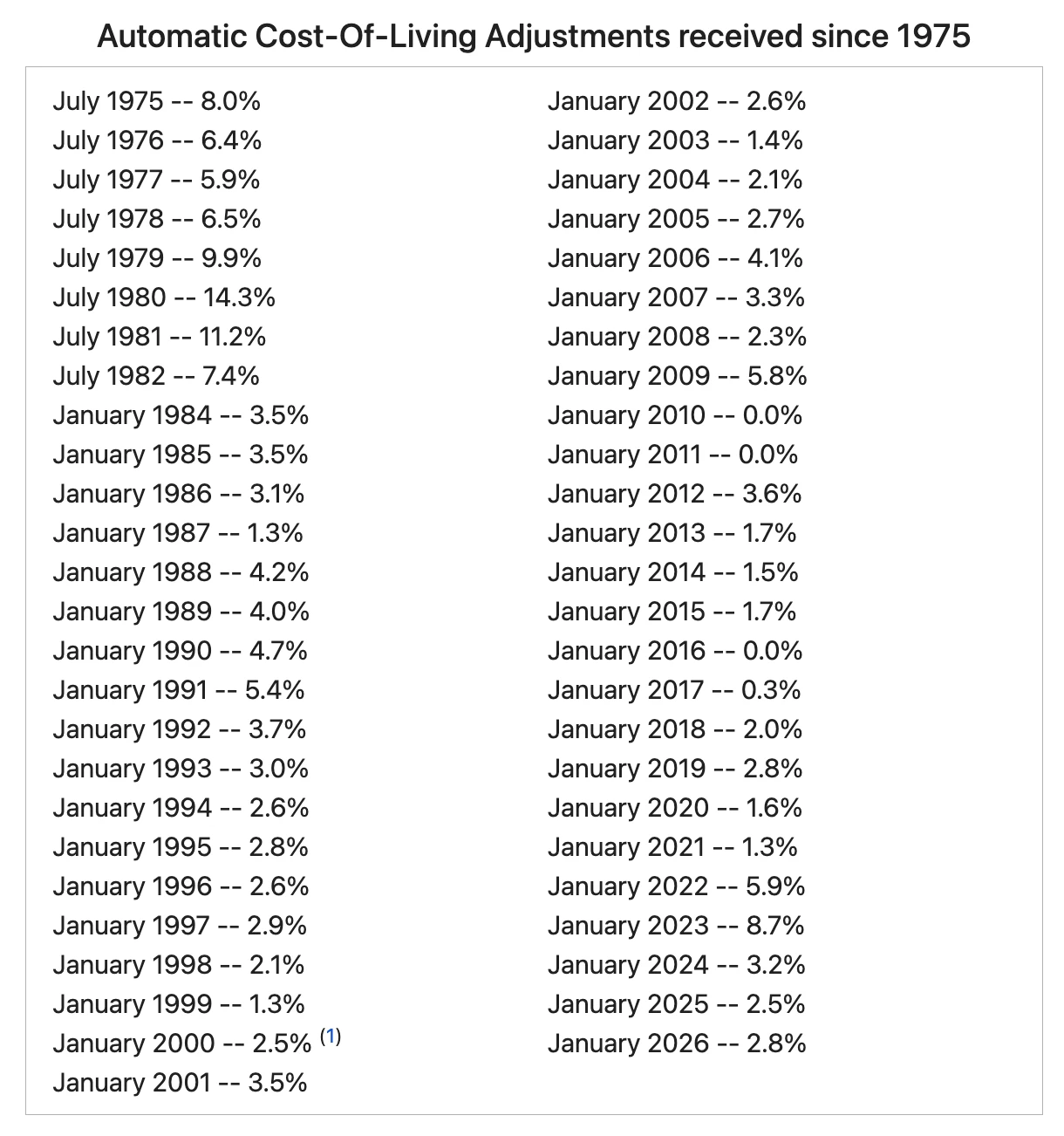 Below, you can find a list of historic COLA’s from SSA.gov.